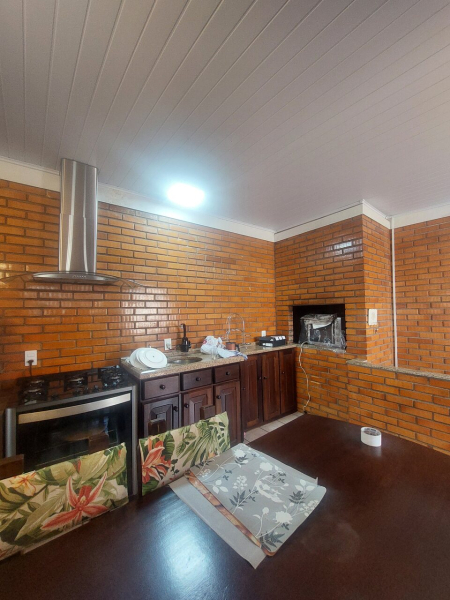 Área de festas com cozinha e churrasqueira, banheiro, piscina.